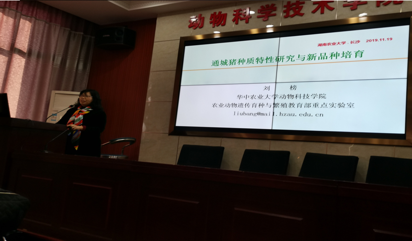 首先,是由刘榜教授给我们带来以“通城猪种质特性研究与新品种培育”为主题的报告。刘教授向我们介绍道通城猪体格中等,皮毛色“黑头黑尾一颗星”即头颈和臀尾为黑色,躯干、四肢为白色,额上有一小撮白毛,其肉质鲜嫩,肉色鲜红,风味独特。刘教授还重点谈到通城猪对蓝耳病具有抗病性,并介绍道自己团队对通城猪的此特性做的实验研究。在报告后的讨论中,根据同学们提问的通城猪是否能抗非洲猪瘟时,刘教授也表示对于通城猪是否抗非洲猪瘟还有待研究。报告中,学院研究生与刘榜教授开展了热烈交流。